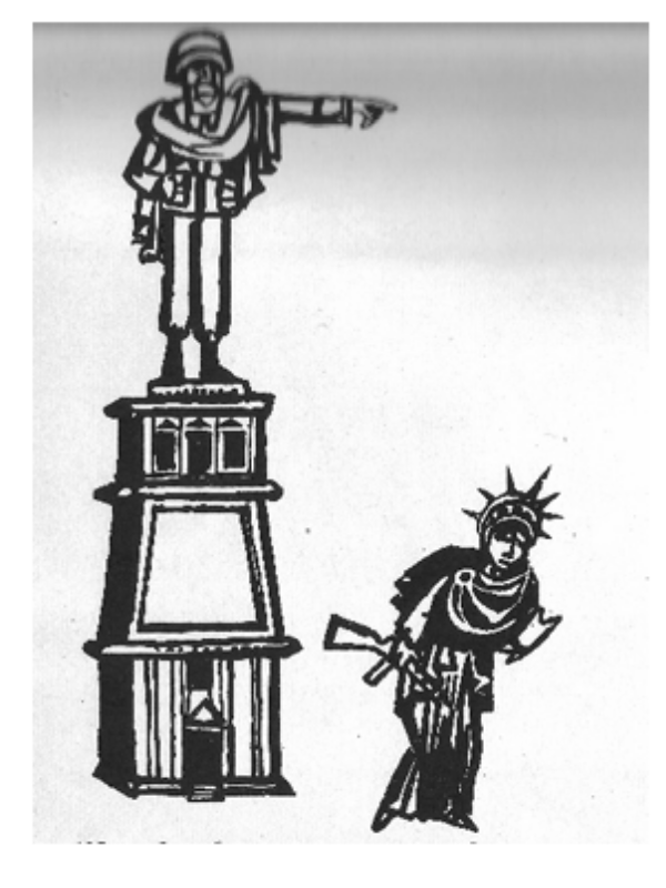 Çizerin ikinci karikatüründe ise daha sert bir mesaj bulunur. Karikatürde yüksek, kaide üzerinde duran, askeri üniformalı, buyurgan bir şekilde sağa doğru parmağıyla işaret eden bir erkek figürü görülmektedir. Figürün duruşu ve anıtsal kaidesi, Sovyet veya Doğu Bloğu ülkelerinde yaygın olan kahramanlık anıtlarını veya yöneticilerin otoritesini simgeleyen heykelleri çağrıştırmaktadır. Anıtın boyutu ve konumu da iktidarın ezici gücünü ve yönlendiriciliğini vurgulamaktadır. Aşağıda yerde ise Özgürlük Heykeli görülür. Özgürlük Heykeli meşale veya yasa tabletini taşımak yerine, askeri bir silah tutmaktadır ve belirgin bir şekilde hizmetkar veya eğilmiş bir pozisyondadır. Bu gösterimle çizer , genellikle ABD’yi veya Batı Kapitalizmini temsil eden Özgürlük Heykeli’nin yozlaşmış veya militarist bir versiyonunu sunarak, Soğuk Savaş döneminin Batı propagandasına bir eleştiri yapmaktadır.