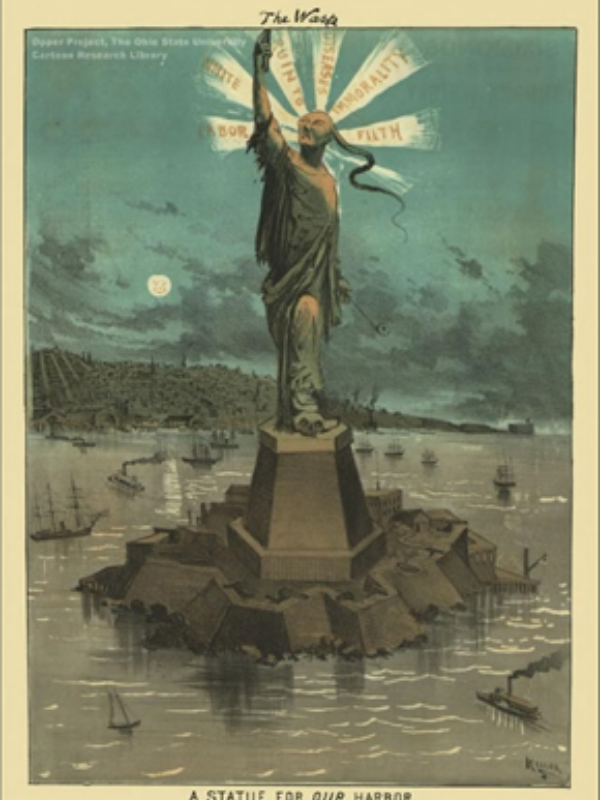 Özgürlük heykelinin karikatürde kullanılmasına ilk örneklerden birinin 1881 yılında San Francisco merkezli The Wasp adlı dergide yayınlanan “A Statü For Our Harbor” adlı çizim olduğunu biliyoruz. Bu kullanım, heykel henüz tamamlanmamışken yayımlanmış bir siyasi hiciv örneğidir. Karikatürde, bir Çinli göçmen figürü, bir meşale yerine tütün piposu tutarken; başından yayılan ışınlarda “pislik”, “ahlaksızlık”, “hastalık” gibi sözler yer alır.