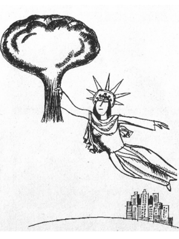 Yazımızda Bulgar karikatürist Assen Grozev’in konuyla ilgili iki karikatürüne de yer vermek istedim. Kendine özgü çizgileriyle o da görüşlerini çizgilere aktarmış. Karikatürlerden ilkinde Özgürlük Heykeli elinde atom bombasının mantar şeklindeki dumanını tutarak uçmaktadır. Aşağıda gökdelenlerden oluşan New York’un silüeti izlenmektedir. Heykelin yüzüne bakılacak olursa bunu gururla taşıdığı anlaşılmaktadır. Normalde özgürlüğü, aydınlanmayı ve insan haklarını temsil eden Özgürlük Heykeli burada bir yıkım simgesiyle (nükleer patlama) özdeşleşmiştir. Bu, “özgürlük” adına yapılan savaşların, nükleer silahlanmanın ya da Amerika’nın dünya üzerindeki politikalarının özgürlük getirmediği, aksine felakete yol açtığı anlamına gelebilir. Karikatür, Soğuk Savaş dönemine ait tipik bir temayı işler: Batı dünyasının barış ve demokrasi söylemlerinin ardında nükleer güç gösterisi ve tehdit vardır. Heykelin elindeki patlama bulutu, Amerika’nın “özgürlük elçisi” kimliğini ironik biçimde tersine çevirir.